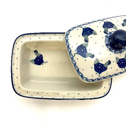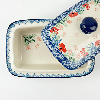 Butter dish is 6.5"L x 4.5"W x 3"H. Store your butter in style! Hand painted by the Ceramika Artystyczna factory. Oven, microwave and dishwasher safe.