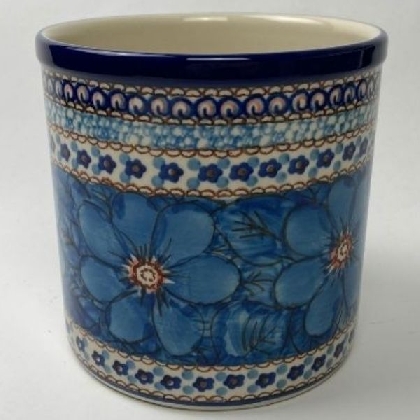 Unikat (unique) Utensil crock is 6" high and 5.5" across. A beautiful and practical way to keep your favorite utensils close at hand. These intricate designs are all signed by the artist who created them. True works of art to add to your Polish pottery collection. Hand painted by a master artist at Ceramika Artystyczna. All pottery is oven, microwave and dishwasher safe.