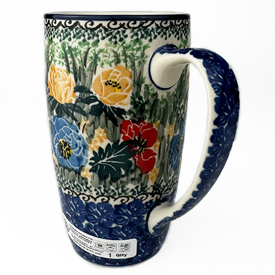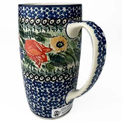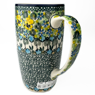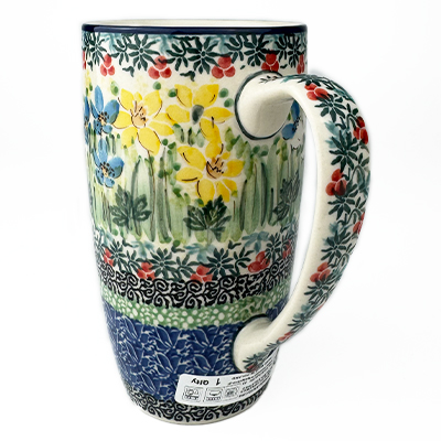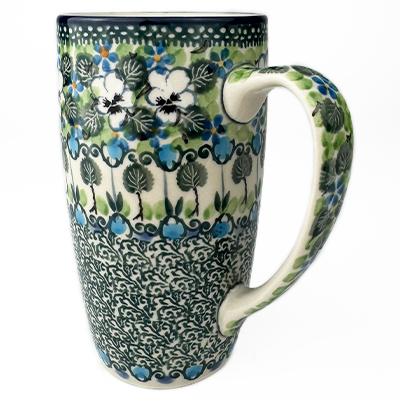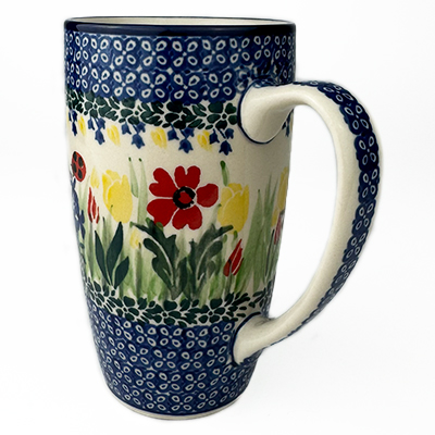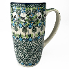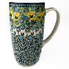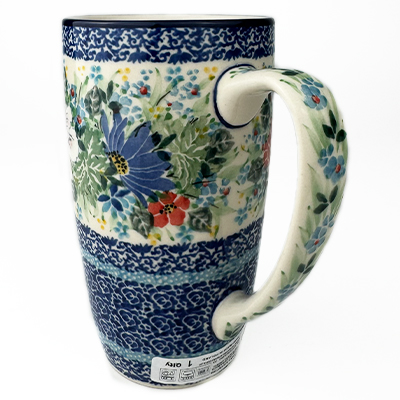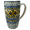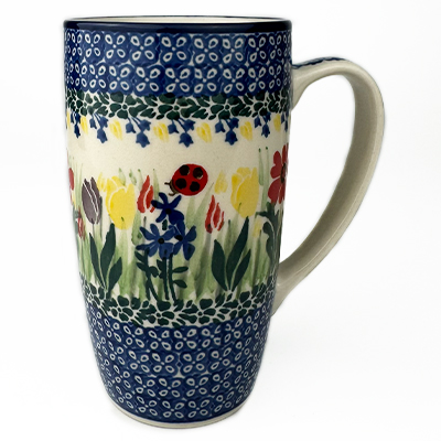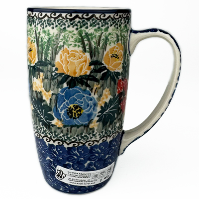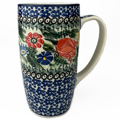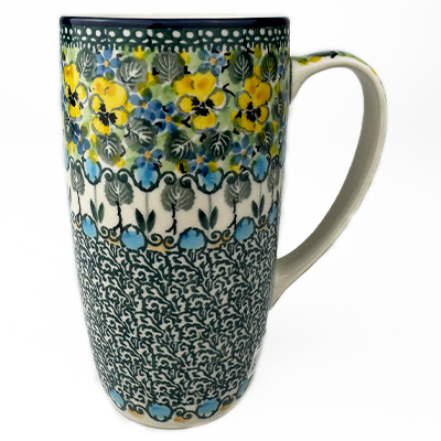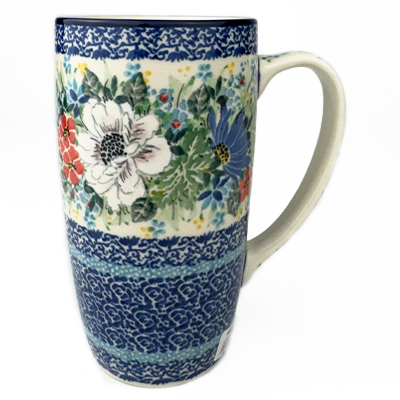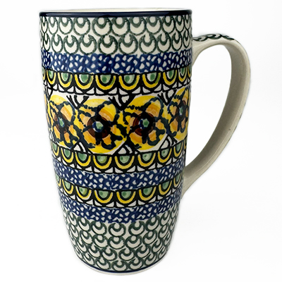 This Unikat Latte Mug is 5.5" tall by 3" wide.. These intricate designs are all signed by the artist who created them. True works of art to add to your Polish pottery collection. Hand painted by a master artist at Ceramika Artystyczna. Oven, microwave and dishwasher safe.