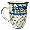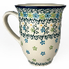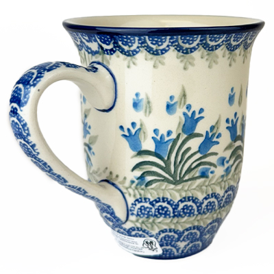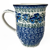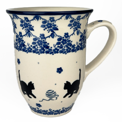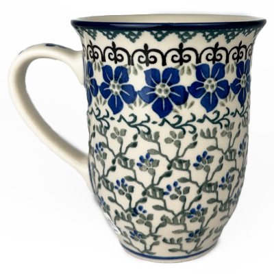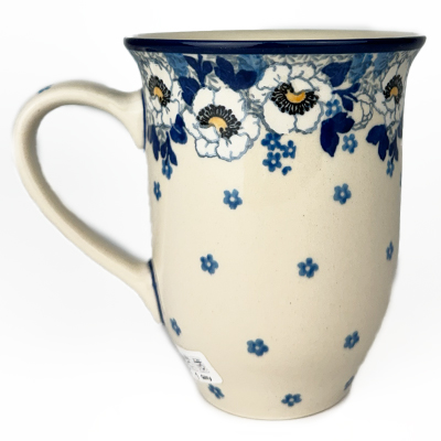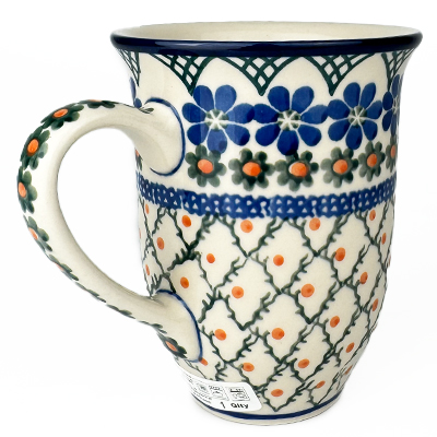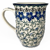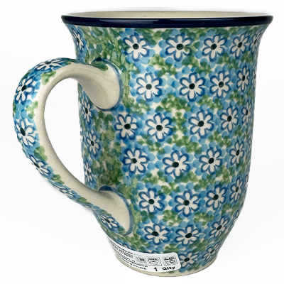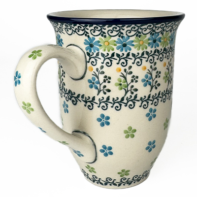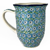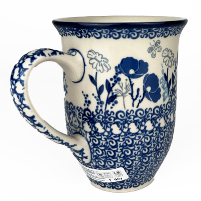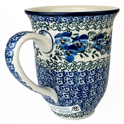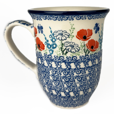 14 oz bistro mug is 5" high. This beautiful mug is flared at the top and has a generous handle. Hand painted by Ceramika Artystyczna and is oven, microwave and dishwasher safe.