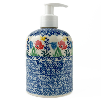 This dispenser is 6" high and will look beautiful in your kitchen or bathroom for lotions or soap. Hand painted by Ceramika Artystyczna.