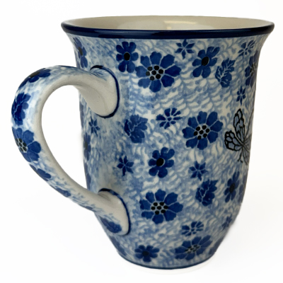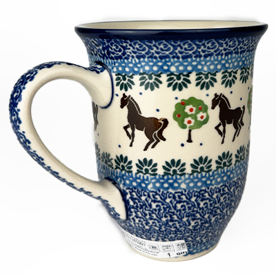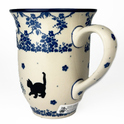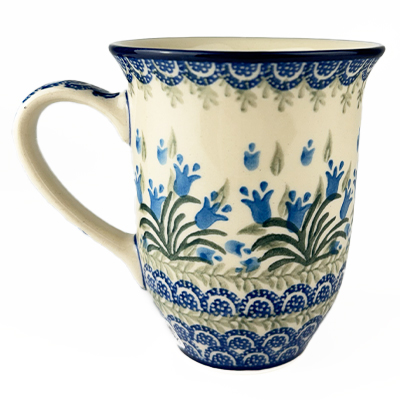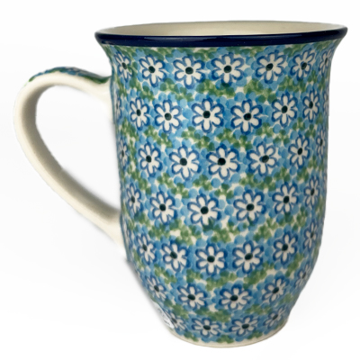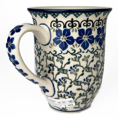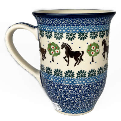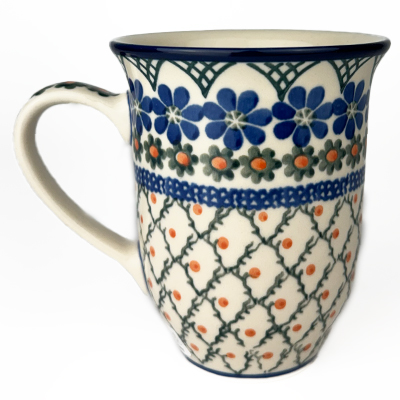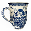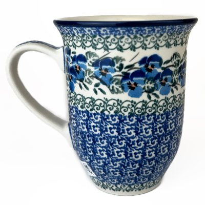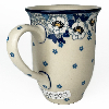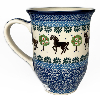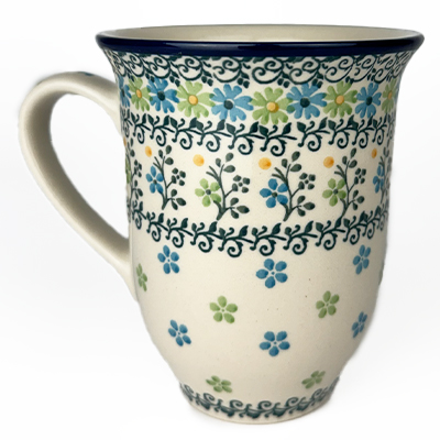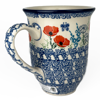 14 oz bistro mug is 5" high. This beautiful mug is flared at the top and has a generous handle. Hand painted by Ceramika Artystyczna and is oven, microwave and dishwasher safe.